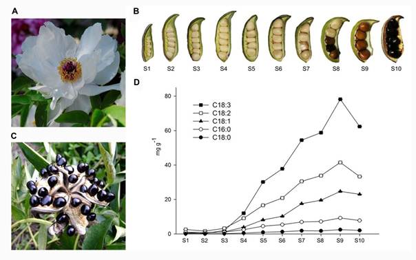 牡丹(Paeonia section Moutan DC.)是我国最具潜力的木本油料作物。牡丹籽油于2011年被国家卫生部批准为新资源食品,其不饱和脂肪酸占总脂肪酸含量的比例高达90%,被誉为“植物脑黄金”的α-亚麻酸占总脂肪酸含量的40%以上。由于种子采收期不一致、品种混乱等问题,致使不同企业生产的牡丹籽油品质参差不齐。近日,中科院植物研究所王亮生研究组在油用牡丹种质资源评价和α-亚麻酸积累机制方面取得了新进展。