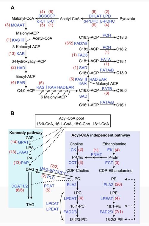 图2 牡丹种子中脂肪合成途径(A:脂肪酸生物合成途径;B:三酰甘油生物合成途径)