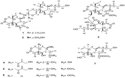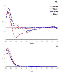 在前期研究中,中国科学院新疆理化技术研究所资源化学研究室科研人员从驱虫斑鸠菊种子中发现了具有较强抗癌活性的倍半萜类化合物2个,倍半萜二聚体2个。通过对驱虫斑鸠菊种子去油后用石油醚、乙醚、甲醇以1:1:1的提取物进行进一步的研究,用硅胶、ODS、Sephadex LH-20、全自动纯化系统以及半制备液相色谱进行分离纯化,分离出倍半萜二聚体3个(vernodalidimers C, D 和 E,1,2,和 3)以及倍半萜内酯4个(5, 6, 7和8),并且通过比较三个二聚倍半萜类化合物的实验CD与计算CD,确定了其绝对构型。上述化合物丰富了驱虫斑鸠菊中的化合物库,也为深入研究和开发驱虫斑鸠菊提供了一定的科学依据。