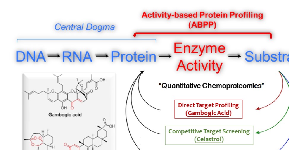 研究人员在前期通过青蒿素探针化的化学蛋白质组学研究方法,揭示了亚铁血红素激活过氧桥键的活化机制(ACS Chem. Biol., 2016),在此基础上进一步发现了青蒿素分子(Artemisinin)与恶性疟原虫翻译调节肿瘤蛋白(Plasmodium falciparumtranslationally controlled tumor protein, PfTCTP)的特异结合肽段及作用氨基酸位点。此外,通过结合研究组新近发展的定量与比较蛋白质组学技术,深入开展了针对具有抗癌抗炎活性的复杂天然产物藤黄酸(Gambogic acid)和雷公藤红素(Celastrol)的分子活性方面的研究。利用先进的ABPP策略,他们合成了基于藤黄酸分子骨架的活性探针,在活细胞内筛选出100多个在生理条件下与藤黄酸分子特异结合的蛋白。原位标记表明大部分藤黄酸靶点蛋白位于细胞质中。通过体内敲除实验,证明RPS27A蛋白对藤黄酸的抗肿瘤作用起到关键作用。与藤黄酸不同,雷公藤红素通过共价可逆的模式修饰蛋白巯基。因此,他们采取竞争性ABPP策略,利用非选择性的活性巯基探针筛选出60多个与雷公藤红素结合的蛋白;通过生信分析推测,雷公藤红素可能通过调控细胞内氧化还原代谢平衡引起癌细胞凋亡。