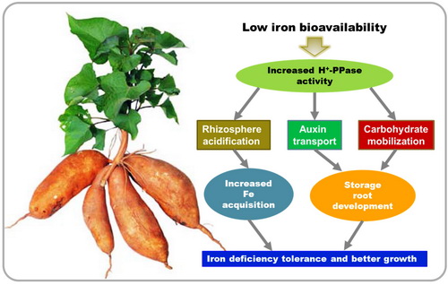 范维娟等研究发现,铁素缺乏条件下甘薯氢离子焦磷酸化酶IbVP1表达显著上调。IbVP1基因在六倍体甘薯基因组中只有一个拷贝,也受生长素诱导表达,可通过提高根际的酸化增强对铁的获取。进一步研究表明过表达IbVP1基因可显著提高该酶及质膜H+-ATPase的活性,导致根际酸化加强。正常有铁缺素的条件下IbVP1过表达甘薯植株长势变强,根系增加,并通过上调铁吸收相关基因的表达提高对铁的吸收,铁含量增加。同时,碳水化合物的代谢加强,上调AGPase及SUT1的表达和下调β-amylase基因的表达,转基因甘薯抗氧化能力提高,抗逆性增强,产量提高。