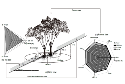 中国科学院西双版纳热带植物园生态水文研究组博士研究生吴骏恩在研究员刘文杰的指导下,采用氢、氧稳定性同位素示踪等方法,以橡胶-茶复合模式为例,对旱季植物的空间水分利用方式及系统的土壤水分传输、分布规律进行了相关实验。结果表明,橡胶树和茶树采用了不同但互补型的土壤水分获取方式(从土壤层中分区利用水分,即水文生态位的分离),从而减弱了它们之间对旱季有限水分的直接竞争、增强了植物的水分利用效率,利于橡胶树和茶树间的共存;茶树在旱季主要从土壤0~30 cm深度获取水分(> 40%),橡胶树则主要从土壤30~80 cm深度获取水分(> 35%),但沿坡面侧向获取水分的比例没有显著差异;茶树行带间的上下坡土壤中包含较多的水分,然而复合系统潜在的合作式水分再分配功能(即水平、垂直方向的水分传输和运移),可以将茶树下较丰富的水分重新分配到系统的各坡位。因此,在橡胶-茶叶复合系统中,植物对土壤水分垂直方向的互补型分区利用、水平方向的水分再分配和水分运移,确保了植物间的共存,增强了系统抵御干旱胁迫的能力。