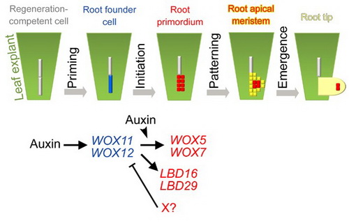 根从头发生是指离体或受伤的植物体再生出不定根的过程。拟南芥根从头发生的细胞命运转变主要分为两步进行:第一步由再生潜能细胞转变为根创始细胞,第二步由根创始细胞转变为根原基细胞。这项研究以拟南芥叶片外植体的不定根再生过程为研究体系,发现转录因子基因WOX5及其同源基因WOX7特异性地在根原基起始时表达,并影响不定根再生的速率和根原基的细胞分裂。当WOX5/7的功能缺失,叶片产生的不定根原基细胞分裂紊乱,根尖分化异常。WOX5/7基因的转录受到其同一家族转录因子WOX11和WOX12的直接激活。WOX11/12通过激活WOX5/7的表达将细胞命运由根创始细胞转变为根原基细胞,实现不定根再生过程。
