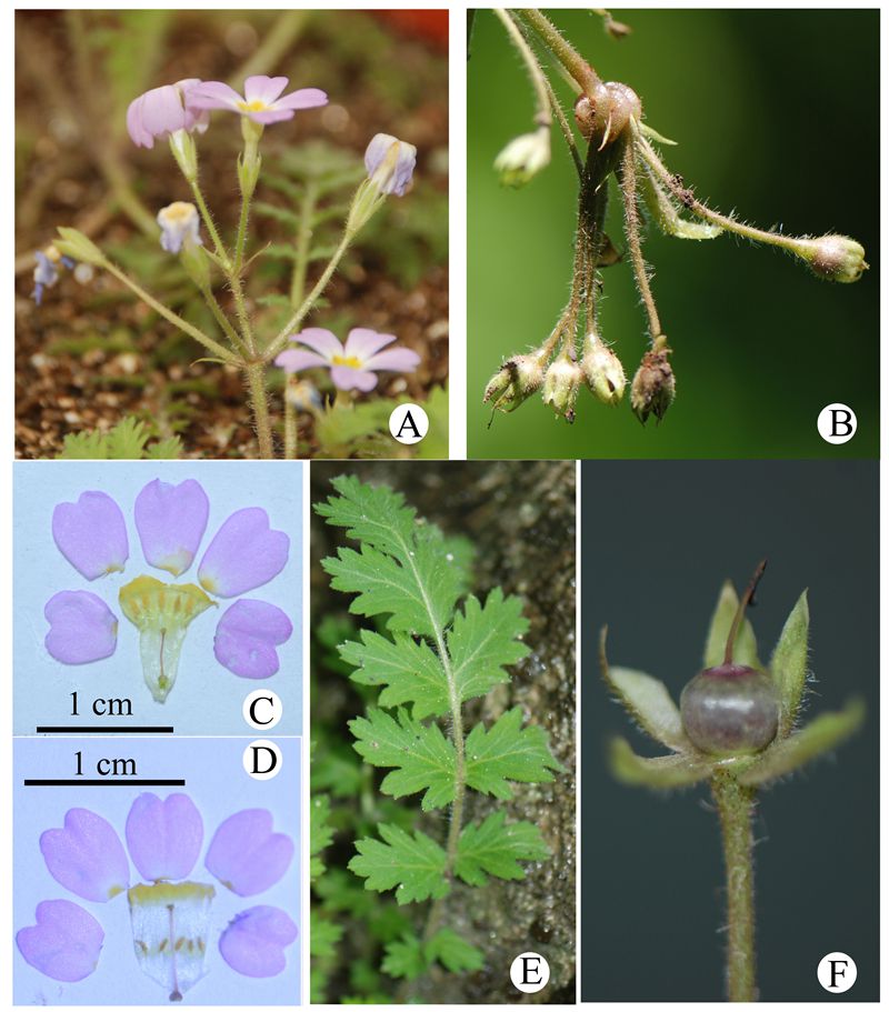 图2.湖北羽叶报春A.花序B.果序C.短花柱花D.长花柱花E.叶F.果.