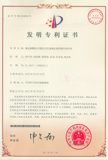 由中科院华南植物园科研人员完成的“桃金娘酮化合物及其在制备抗菌药物中的应用”获得国家发明专利授权(专利号:ZL201510182272.2)。