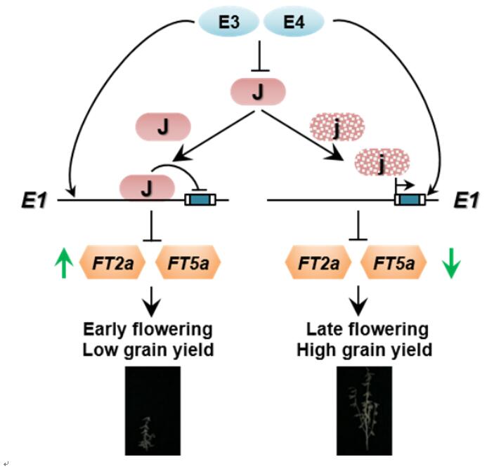 中科院华南植物园侯兴亮研究员课题组与中科院东北地理与农业生态研究所孔凡江研究组和刘宝辉研究组以及中国科学院遗传与发育生物学研究所田志喜研究组合作,通过正向遗传学的方法图位克隆了J基因,证明其为拟南芥EARLY FLOWERING 3 (ELF3)的同源基因,并通过功能互补实验和近等基因系等方法验证了基因的功能。研究表明,在短日照条件下,J蛋白通过与大豆光周期途径关键开花因子E1启动子上的LUX元件相结合,抑制E1基因的表达,从而解除了E1对FT表达的抑制,促进开花。另一方面,J基因的转录则受到光敏色素蛋白E3和E4的抑制。这些原创性发现揭示了控制大豆光周期开花途径的特异PHYA-J-E1-FT分子遗传网络。研究团队进一步验证了在低纬度条件下,J基因突变后能够延迟大豆成熟期,大大提高了大豆产量。与野生型J相比,突变型j能提高大豆产量达30-50%;群体遗传学分析发现,J基因在适应低纬度的大豆品种中至少存在8种功能缺失型的自然等位变异,这些变异的产生是促进大豆生态适应性的关键因素,已经在低纬度地区(我国南方)被广泛应用于提高大豆产量的育种中,对大豆生产起着极其重要的作用。