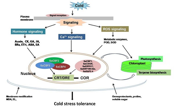 中科院华南植物园张新华博士等科研人员对低温(4℃)处理条件下檀香冷响应和适应机制进行了较全面的研究。结果显示:在低温胁迫条件下,檀香具有积极的冷响应保护机制。表现在:丙二醛(Malondialdehyde), 脯氨酸(Proline)和可溶性糖(Soluble carbohydrates)的积累, 抗氧化物酶SOD与POD的水平显著增加;细胞膜转运、Ca离子、ROS,以及植物激素信号等相关的转录本显著性上调表达;更重要的发现,在冷胁迫中8个檀香萜烯化合酶基因在植物叶与根组织中存在重要的差异表达;另外鉴定了4个冷驯化关键调节基因-CBFs转录因子,其中,在冷胁迫12 h和24 h时,CBF2-CBF4的表达量是对照组的50-200倍,结果暗示了依赖CBF的冷信号转导途径很可能在檀香冷忍耐中扮演关键的角色。该研究结果为檀香栽培与育种,以及檀香油生物合成机制研究提供重要的理论基础。