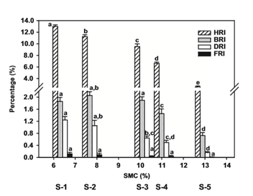 结果表明人类采伐、放牧、干旱和火灾对树苗死亡的影响分别为80%、15%、14.5%、0.5%。人类对具有大型冠层树苗(如Terminalia tomentosa,Shorea robusta)采伐较多,这可能导致将来热带干旱森林区系组成的改变。此外,在该研究中,土壤湿度最低的位点,含有最少的物种和树苗数目,并且树苗受到的干扰最大。因此,为了保护和提高树苗的多样性和补充,他们建议限制非法(未经授权)采伐森林,并且控制森林内放牧。特别是优势物种和具有高潜在生物量的树苗需要得到保护。