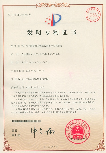 由中科院华南植物园魏孝义、吴萍等科研人员完成的“淫羊藿素衍生物及其制备方法和用途”获得国家发明专利授权(专利号:ZL201510054471.5)。
