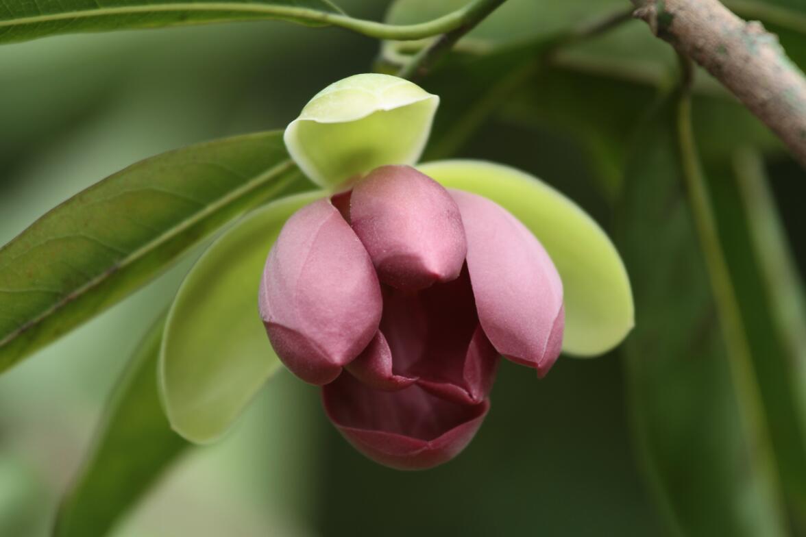 “绿衣紫鹃”为园艺中心科技人员所选育,是2008年以长叶木兰(Magnolia paenetalauma Dandy)为母本、美丽二乔玉兰(Magnolia × soulangeana Soul. -Bod. 'Meili’)为父本经人工杂交获得的杂交一代品种,于2013年首次开花。专家组在华南植物园木兰园实地考察了“绿衣紫鹃”及其父母本,详细比较了新品种与其父母本的株型、茎、叶和花等形态特征,听取了新品种培育的汇报,对新品种进行DUS(特异性、一致性和稳定性)审查。专家组一致认为“绿衣紫鹃”在花被片和雄蕊颜色等方面与父母本存在显著差异,且遗传性状稳定一致,确认“绿衣紫鹃”新品种成立。