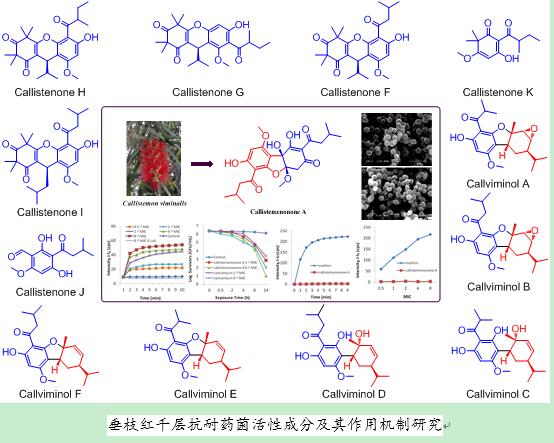 最近,课题组在垂枝红千层(Callistemon viminalis)的研究中,发现了1个具有新颖结构和12新的间苯三酚类衍生物,通过多重波谱解析、ECD计算等方法确定了这类化合物的化学结构和绝对构型;并基于多样性合成的手段,对部分分子进行了相应的构效关系研究。在这些活性化合物中,新化合物callistemenonone A具有新颖的二聚间苯三酚结构;对其生源合成途径进行假设,认为氧化偶联、去芳香化以及Micheal加成反应为其生物合成途径中的关键步骤。随后的活性研究发现,callistemenonone A对多种革兰氏阳性菌表现出广谱的抗菌活性,包括抗耐甲氧西林金黄色葡萄球菌(MRSA)。深入的抗菌机理研究初步地揭示了化合物callistemenonone A与常见天然产物破坏细菌膜通透性等作用机制不同,它可能通过改变细菌的膜电势而实现了细菌的快速杀灭。当前的研究结果表明,callistemenonone A能作为具有明朗药物开发应用前景的抗菌先导化合物进行进一步深入的研究。