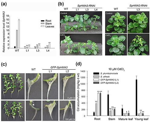 中国科学院植物研究所王亮生研究组科研人员从伴矿景天中克隆到一个重金属转运蛋白基因SpHMA3,并通过首次建立这类镉超富集植物和非超富集生态型东南景天(Sedum alfredii)的稳定遗传转化系统,在景天植物中实现SpHMA3基因沉默和过表达。研究发现,SpHMA3蛋白定位于液泡膜上,对镉离子具有特异转运能力;SpHMA3基因在伴矿景天的地上部高丰度表达;通过RNAi沉默使该基因表达下降,在镉处理条件下地上部新生组织的生长受到严重抑制,但并不影响镉在地上部积累。这些结果表明,SpHMA3是伴矿景天进行镉解毒的关键基因,对植株在含镉土壤环境中维持幼叶正常生长发育发挥重要的作用。