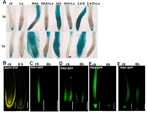 版纳植物园园艺植物育种研究组的研究生刘阳阳和孙亮亮在导师徐进研究员指导下,以拟南芥为材料,采用植物生理学、药理学、遗传学和分子生物学等研究手段,对稀土元素La调控植物根系发育的生理与分子机制进行了深入系统的研究。前期研究表明,高浓度La诱导主根根尖中的活性氧 (ROS)过度积累,并诱导了主根根尖细胞死亡,从而导致主根根尖分生组织细胞分裂潜力和干细胞龛活性丧失 (Liu et al., 2017, Journal of Experimental Botany)。继续研究还发现,镧处理还显著抑制了生长素转运蛋白AUX1和PIN1/2/4/7在主根根尖的丰度,但侧根的生长素转运蛋白的丰度并未受到影响。因此,镧处理降低了生长素在主根根尖的分布,从而抑制了主根生长。这一研究近期以Lanthanum Inhibits Primary Root Growth by Repressing Auxin Carrier Abundances in Arabidopsis为题,发表于国际植物学刊物Frontiers in Plant Science。