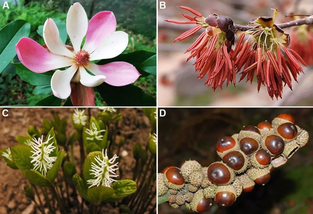 Representative taxa from eastern China. A. Manglietia, B. Euptelea, C. Chloranthus, D.Lithocarpus.