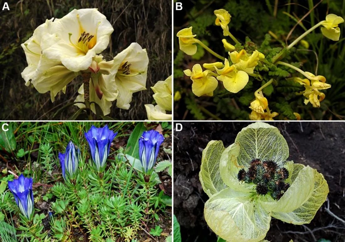 Representative taxa from western China. A. Rhododendron, B. Pedicularis, C. Gentiana, D.Saussurea.