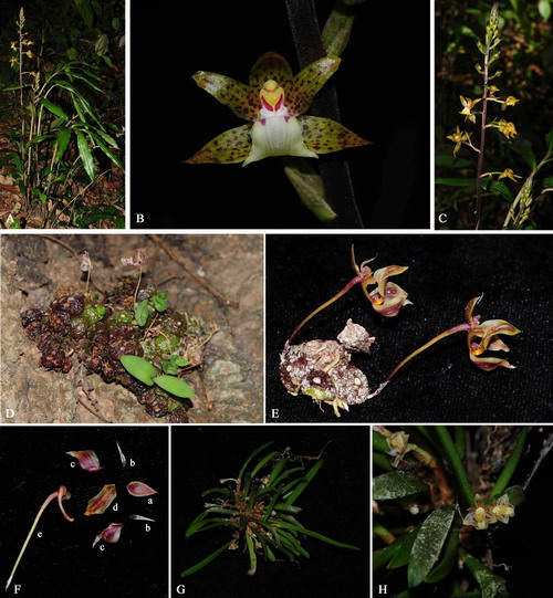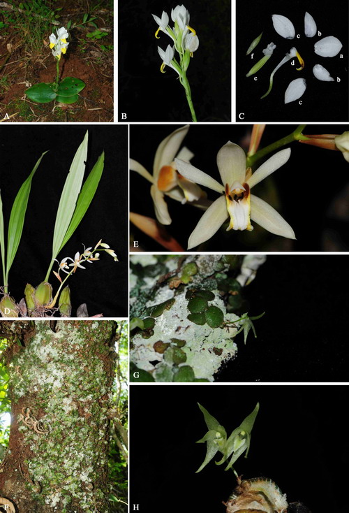 文章图版1:A-C: Plocogllotis bokorensis. A. plant; B. flower face view; C. inflorescence; D-F: Drymoda siamensis; D. plant; E. flower side view; F. flower (a. dorsal sepal; b. petals; c. lateral sepals; d. lip; e. pedicel and ovary with column-foot); G-H: Ceratostylis siamensis. G: plant; H. flower.