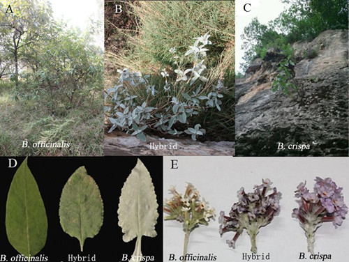 图1 密蒙花、皱叶醉鱼草及其杂交后代的生境与形态特征