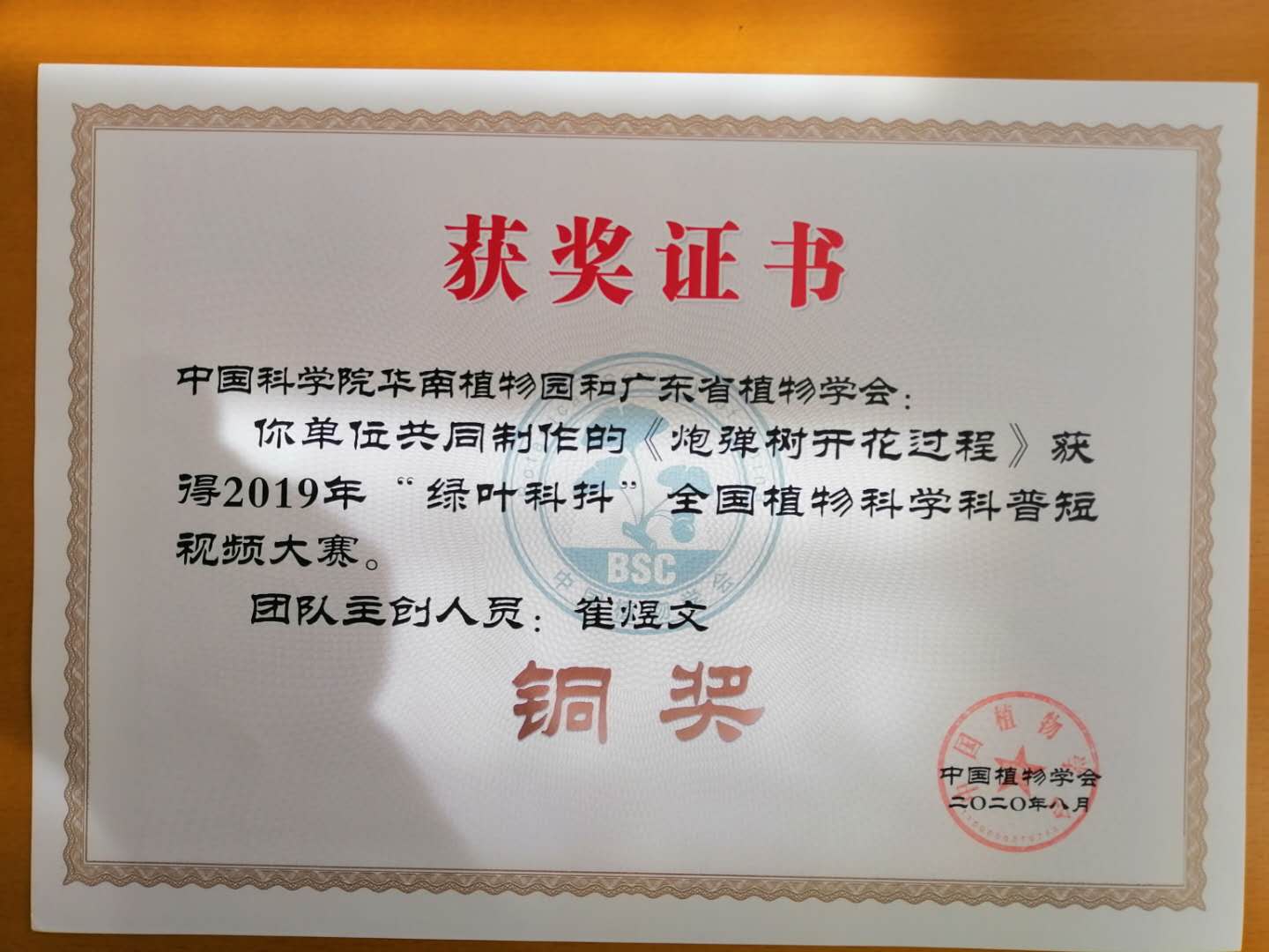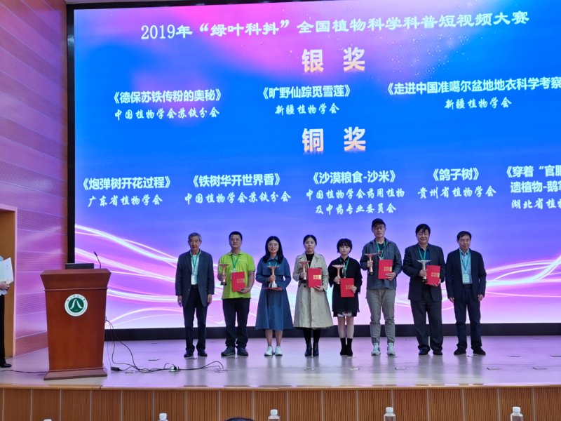 接下来举行了中国植物学会2019年科普活动获奖作品和优秀组织单位的颁奖仪式。我会选送的作品《炮弹树开花过程》获得2019年“绿叶科抖”全国植物科学科普短视频大赛铜奖,我会也因组织工作出色获得优秀组织奖。学会副理事长张寿洲和秘书长陈红锋参会,并上台领奖。